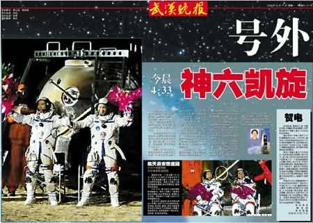 2005年10月17日4时33分,神舟六号返回舱在内蒙古四子王旗中部草原成功着陆,航天员费俊龙、聂海胜平安返回。图为武汉晚报10月17日神六报道版式图。 信息来源:插座网 http://www.chazuo.com.cn/
