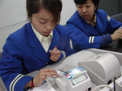 工作人员在为第一张IC卡输入信息售出第一张卡