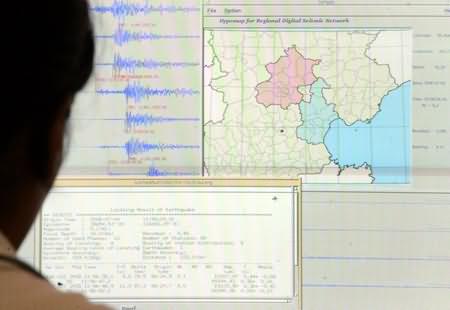2006年7月4日,北京地震局的工作人员正在监测地震波形图和震中图。当日中午11时56分河北文安一带发生5.1级地震。北京、天津等地普遍有明显震感。图文:北京地震局的工作人员