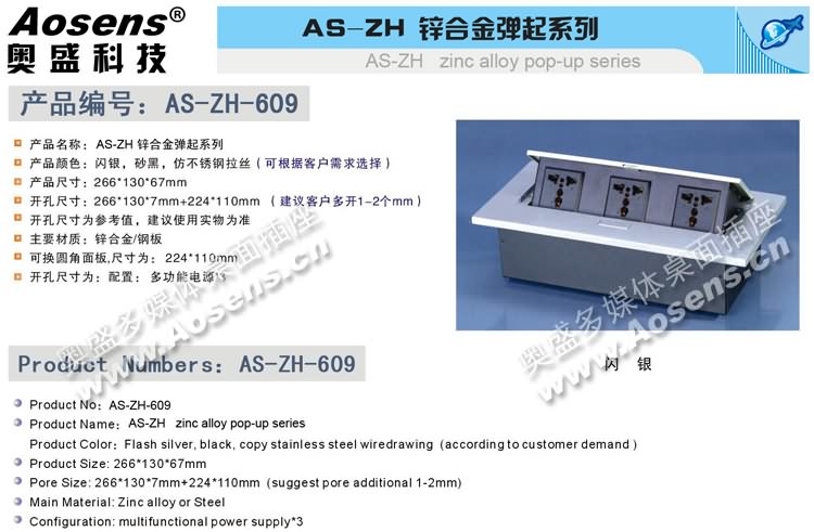 Aosens奥盛桌面插座,国际品质,质保1年,10年维护。产品按开启方式分类:弹起式、滑盖式、吊装式、电动翻转、手动翻转、毛刷翻盖、升降式、多媒体面板和穿线盒等;按产品材质分类:锌合金、镁铝合金和T5强度铝合金等;按制作工艺分类:欧洲氧化、拉丝氧化、喷砂氧化和烤漆喷涂工艺等。全定制Aosens桌面插座广泛用于中高档大班台会议桌面,各种高级酒店、办公楼、实验室、银行、政府工程办公系统中等多媒体集成场所使用,典型案例:外交部,交通部、中央电视台、中国银行、首都机场等重点单位.产品配件,工艺流程,完全符合环保标准,产品远销海内外.Aosens桌插详情请访问:www.aosens.cn