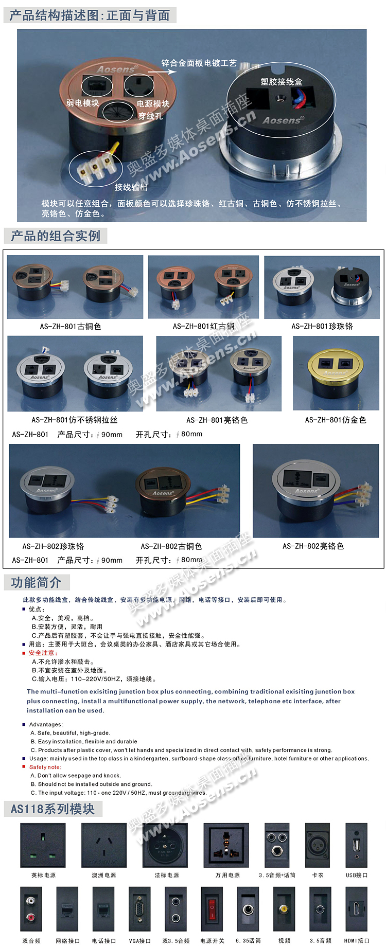 Aosens奥盛桌面插座,国际品质,质保1年,10年维护。产品按开启方式分类:弹起式、滑盖式、吊装式、电动翻转、手动翻转、毛刷翻盖、升降式、多媒体面板和穿线盒等;按产品材质分类:锌合金、镁铝合金和T5强度铝合金等;按制作工艺分类:欧洲氧化、拉丝氧化、喷砂氧化和烤漆喷涂工艺等。全定制Aosens桌面插座广泛用于中高档大班台会议桌面,各种高级酒店、办公楼、实验室、银行、政府工程办公系统中等多媒体集成场所使用,典型案例:外交部,交通部、中央电视台、中国银行、首都机场等重点单位.产品配件,工艺流程,完全符合环保标准,产品远销海内外.Aosens桌插详情请访问:www.aosens.cn