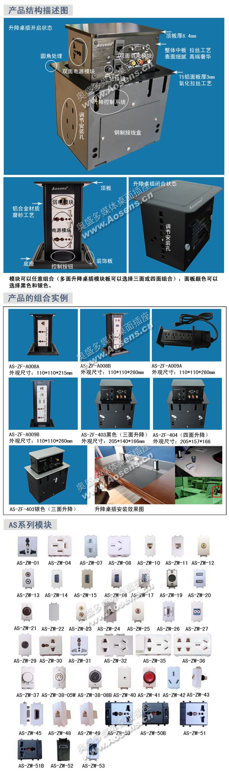 Aosens奥盛桌面插座,国际品质,质保1年,10年维护。产品按开启方式分类:弹起式、滑盖式、吊装式、电动翻转、手动翻转、毛刷翻盖、升降式、多媒体面板和穿线盒等;按产品材质分类:锌合金、镁铝合金和T5强度铝合金等;按制作工艺分类:欧洲氧化、拉丝氧化、喷砂氧化和烤漆喷涂工艺等。全定制Aosens桌面插座广泛用于中高档大班台会议桌面,各种高级酒店、办公楼、实验室、银行、政府工程办公系统中等多媒体集成场所使用,典型案例:外交部,交通部、中央电视台、中国银行、首都机场等重点单位.产品配件,工艺流程,完全符合环保标准,产品远销海内外.Aosens桌插详情请访问:www.aosens.cn