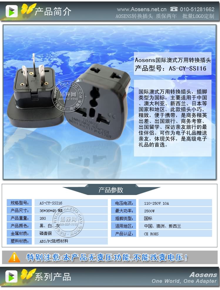 | 904015 | 奥盛单一国际澳式万用旅行转换插头 旅行转换器 | AS-CY-SSI16 | ¥24.00 | ¥12.00 | 立即购买 | |